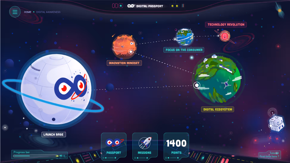 Universe 1 is available to 80k Sodexo middle managers in multiple languages. Its aim is to increase awareness throughout the company of new digital technologies affecting the sector and encourage employees to adopt a new, digital mindset. Learners journey through space and visit different planets to learn about digital technologies and how other organisations are overcoming similar challenges.They also discover how new disruptive business models impact on Sodexo’s strategy moving forwards, how they can foster an innovation mindset, how they can become more customer-centric and how Sodexo is already harnessing the power of disruptive digital technologies.
